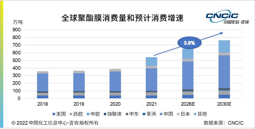 未来,在新能源、消费电子等消费需求的带动下,预计到 2030 年全球各地区聚酯膜的消费量将达 764 万吨,2021-2030 年 CAGR 约 4%。