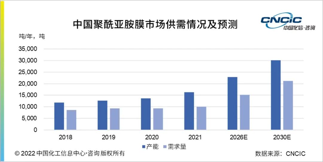 从需求端来看,2021 年国内对 PI 薄膜的总需求量约 1 万吨。目前我国电子级 PI 薄膜与电工级 PI 薄膜整体消费量基本相当,未来随着电子显示、柔性印刷电路(FPC)和导热石墨膜等电子级应用领域的快速增长,电子级 PI 薄膜消费量规模将进一步增大。预计到 2030 年对 PI 薄膜的总需求量将超过 2 万吨,年平均增长率为 8.6%。