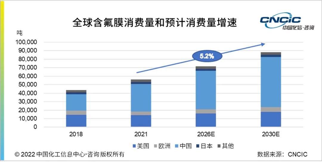 2021 年,全球含氟膜的总消费量约 5.6 万吨,市场规模约 24 亿美元;预计至 2030 年全球消费需求将达 8.5 万吨,年均增速约 5.4%。其中,PTFE膜、PVF 膜、FEP 膜、PVDF 膜和 ETFE 膜五种含氟膜的需求量合计占比超过 95%。