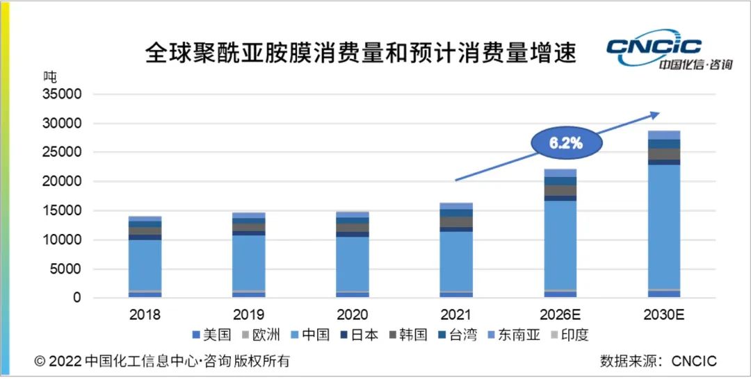 聚酰亚胺(PI)被列为“21世纪最有希望的工程塑料之一”。2021 年,全球 PI 膜消费量约 1.6 万吨,市场规模约 10 亿美元;预计至 2030 年全球消费需求将达 2.9 万吨,年均增速约 6.5%。其市场主要分布在亚洲地区,其中,中国聚酰亚胺的产能和消费量占在全球占比均超 50%。