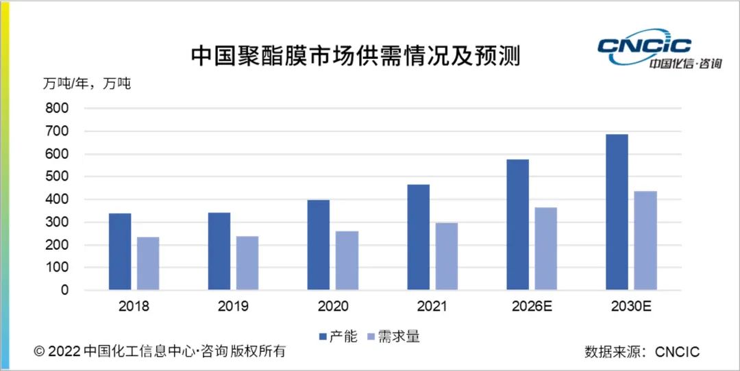 截止至 2021 年,中国 PET 膜行业总产能达 466 万吨/年,较 2020 年增长 17%,预计到 2030 年,将进一步增长至 686 万吨/年。从消费端看,国内需求量从 2011 年的 111 万吨增长至 2021 年的 295 万吨,年平均增长率为 10%;预计到 2030 年将达 435 万吨,年平均增长率为 4.5%。