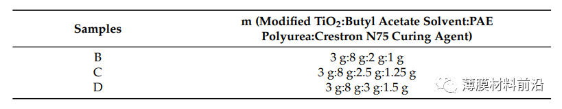 修改后的TiO2在锥形烧瓶中测定乙酸丁酯,并在磁力混合器上搅拌。然后,将PAE聚脲滴加到锥形烧瓶中并搅拌10分钟。最后加入快思聪N75固化剂;PAE聚脲与快思聪N75固化剂的质量比为2:1,溶液搅拌10min至均相。将空气压缩机的压力设置为0.4MPa,倒入溶液,并将样品水平放置,喷嘴距离20厘米。喷枪以均匀的速度从样品的一端移动到另一端,在第二次喷涂之前有10秒的延迟。喷涂后,将样品真空干燥24 h。制备了250种不同质量比的超疏水涂层,即样品B、C和D.样品A为未涂覆环氧树脂板,样品B'、C'和D'分别经过1次磨损后得到,如表<1>所示。改性TiO的比率PAE聚脲的纳米颗粒分别设置为1.5、1.2和1。共加入2~3 gPAE聚脲,同时保持改性TiO的质量在3g时,如表1所示。以乙酸丁酯为溶剂,改性TiO2用于增加涂层的粗糙度。当比例按比例增加时,超疏水涂层性能保持不变,因此以表1为例进行实验说明。