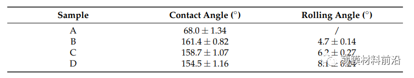 通过试验得到各试样的接触角和滚动角,如表2所示。