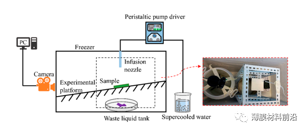 水滴以一定的速度撞击样品,指标是液滴的冻结时间t。实验装置由四个部分组成:制冷装置、输液装置、自制的 30°倾斜支架和计算机,如图3所示。衬底温度为−25~-5°C。输液喷嘴与样品之间的距离控制在10厘米,速度恒定,每分钟10~15滴。相机记录了液滴的冻结过程和液滴的冻结时间。