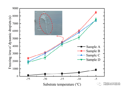 样品A、B、C和D水滴的动态冻结时间均随底物温度的升高而增加,样品B、C和D的冷冻时间与样品A的平坦趋势相比显著增加。样品B、C和D在不同温度下水滴的冻结时间远大于样品A,样品B的水滴冻结时间略长于样品C和D。在−25 °C衬底温度下,样品A、B、C和D的水滴冻结时间分别为126.6 s、2388 s、1934.4 s和1857 s,超疏水涂层水滴的冻结时间平均是环氧树脂板的16.27倍。当基底温度为−5 °C时,样品A、B、C和D的水滴冻结时间分别为867.4 s、8471.7 s、7454.5 s和7524.6 s,超疏水涂层水滴的冻结时间是环氧树脂板的9.01倍(见图9)。