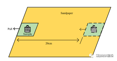 将600目砂纸板固定在地面上作为磨损表面,并将100g重物放置在样品上方作为磨损载荷。一端将细线连接到样品,另一端连接线性往复电机。电机设置为以2厘米/秒的速度运行。用细线以匀速和平行于砂纸方向的力缓慢拉动样品,使样品和砝码一起移动。从砂纸的一端到另一端(20厘米)计算一次磨损事件。经过50次、100次、150次、200次和250次磨损后,观察样品的宏观形状,测量接触角和滚动角度(见图4)。