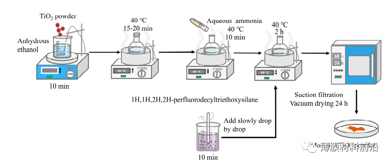 无水乙醇,TiO2以粒径为500 nm的粉末和每(十七烷基)氟癸基三乙氧基硅烷测定制备改性TiO2粉末基于Werner Stöber等人提出的斯托伯方法。制备过程如图2所示。首先,在烧杯I中测定50 mL无水乙醇。共10克TiO2将粒径为500nm的粉末加入烧杯I中,并在磁力搅拌器中以500rpm搅拌10分钟。其次,称取6g所有(十七烷基)氟癸基三乙氧基硅烷在烧杯II中并搅拌10分钟。使用电磁加热搅拌器将去离子水加热至40°C。然后,将烧杯I的液体倒入圆底烧瓶中,将圆底烧瓶置于40°C的水中并继续加热。圆底烧瓶中的溶液也达到40°C后,继续加热5分钟,向其中加入氨水30mL,加热10分钟。慢慢地,将烧杯II中的溶液逐滴加入加热圆底烧瓶中并盖上盖子,继续反应2h。最后,疏水性TiO2除去分散液,倒入内衬滤纸的过滤瓶中,连接循环水型多用途真空泵,泵送至无水滴落下。将上层得到的粉末放入真空干燥箱中干燥24 h,得到改性TiO2粉。