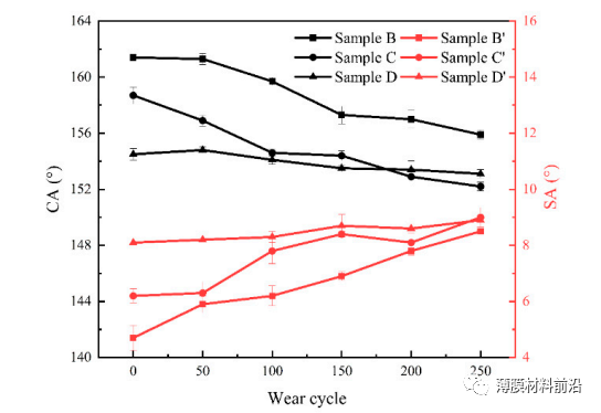 图中的样品B'、C'和D'是经过1次磨损后从表250中的样品B、C和D中获得的。如图10所示,样品B、C和D磨损250次,接触角高于150°,滚动角在10°以内,与初始状态相比变化不大,保持超疏水性。经过250次磨损测试后,三个涂层样品的水接触角和滚动角非常相似。
