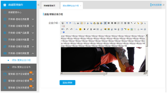 第一步,文本框中编辑企业简介,编辑器可支持上传图片、视频等内容。