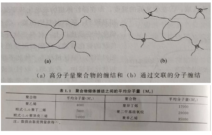 空间特征用缠结点之间的分子量(Me)表示,几种弹性体分子量(Me)见上图。因此,即使没有任何永久分子间键,高分子量聚合物熔体也将显示瞬间的橡胶状行为。在交联的弹性体中,这些缠结被永久锁定,在交联度足够高时,它们