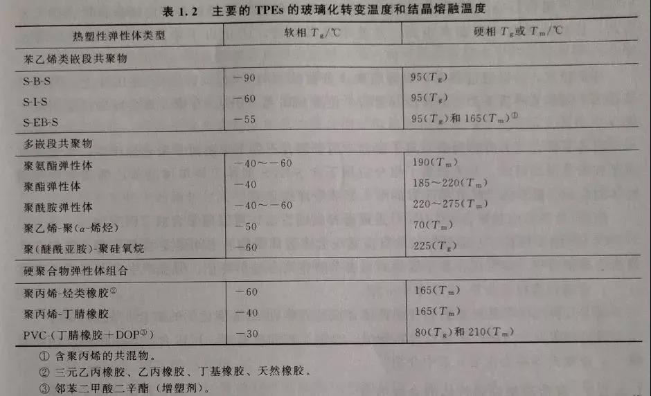 显然,材料的最低使用温度与最高使用温度的范围介于弹性体相的Tg与硬相的Tg或Tm之间。确切的数值取决于最终产品的使用条件,如最终产物对硬化或施加的应力的承受力。因此,实际的最低使用温度要高于弹性体的Tg,最高使用温度要低于硬相的Tg或Tm。主要的热塑性弹性体的玻璃化转变温度和结晶熔融温度见表。