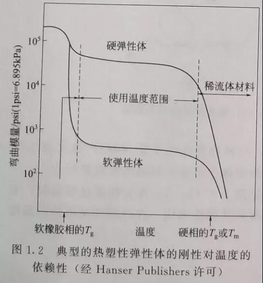 构成相应相的各聚合物保留它们的大部分特性,因此,每一个相显示其特定的玻璃化转变温度(Tg)或晶体熔融温度(Tm)。Tg和Tm可用来确定特定弹性体的物理性质的转变点。图1.2表示在很宽的温度范围内测量的弯曲模量。