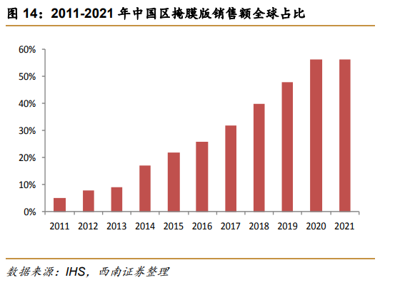 根据SEMI公布数据,2018年全球半导体掩模版销售额为35.7 亿美元,占总晶圆制造材料市场的13%。预计全球半导体掩模版市场可在2020年达到40亿美元。根据 IHS 统计测算,随着国内平板显示行业掩膜版的需求量将持续上升,预计到2021年,中国大陆平板显示行业掩膜版需求量全球占比将达到56%。