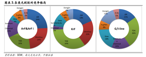 目前,日本JSR、东京应化、信越化学、DOW、富士电子四家企业占据了全球80%以上的市场份额,市场垄断趋势明显。而在高端光刻胶市场上,全球的 EUV 和ArF i光刻胶主要是 JSR、陶氏和信越化学等供应商提供,占有份额最大的是 JSR、信越化学,TOK 也有研发。