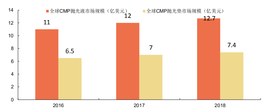 根据 Cabot Microelectronics 官网公开披露的资料,2017年和2018年全球CMP抛光液市场规模分别为12亿美元和 12.7亿美元,预计2017-2020年全球CMP抛光液材料市场规模年复合增长率为6%。抛光垫方面,2016-2018年全球化学机械抛光垫市场规模分别为6.5亿美元、7亿美元和7.4亿美元。