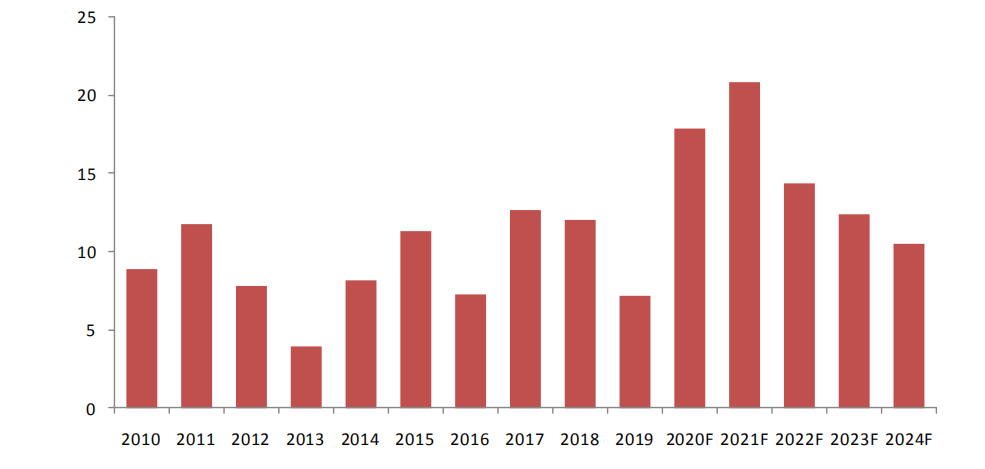 2010年-2024年全球晶圆厂产能增加量