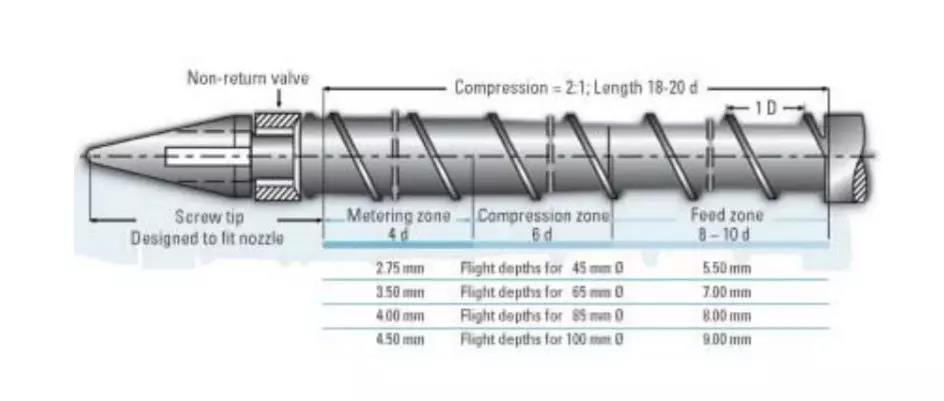 TPU注塑用通常长度的单螺纹,三段螺杆能很好地塑化均匀的熔融物。如果需要高的塑化能力(生产量),可以使用较长的螺杆 (图1.1)。