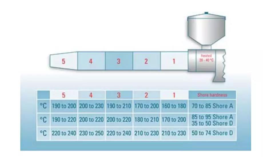 TPU 应在 190 到 220°C 之间的熔融温度下加工。对于一些硬的级别熔融温度可能会提高到 240°C 。图 2.1所示为不同邵氏硬度下对螺筒和射嘴加热设定的指导值。