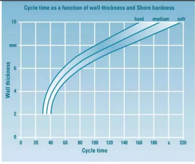 决定循环时间的是物品的形状、壁厚、模具的冷却和材料本身。下图所示为壁厚对注射循环周期的影响,把 TPU量化为三个级别:硬的、中等的、软的。