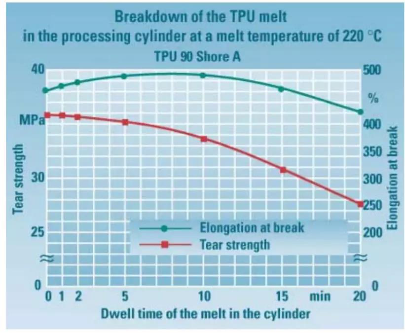 短压缩区螺杆由于高剪切力而不适用。TPU 塑化需要高的能量,要求螺杆有高的扭矩驱动。扭矩不足会导致螺杆转速的波动和塑化的不均匀。在限度之内,较高的螺筒温度会产生良好结果,尽管会冒材料过热的危险。
