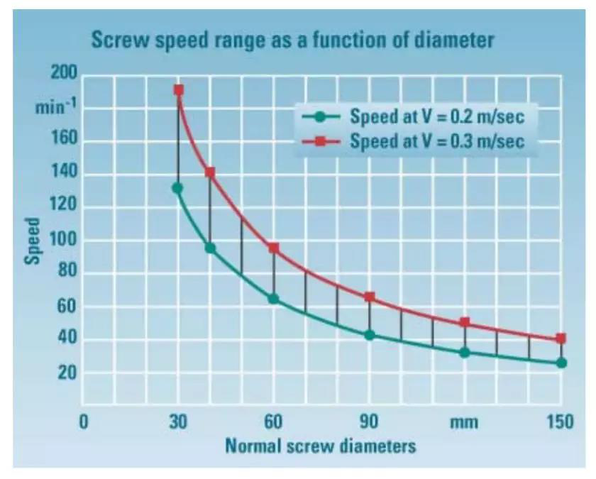 对于塑化速度应选择圆周速率不超过0.3m/s。计量行程应在1D和4D之间。下图所示为不同螺杆直径下最大速度。