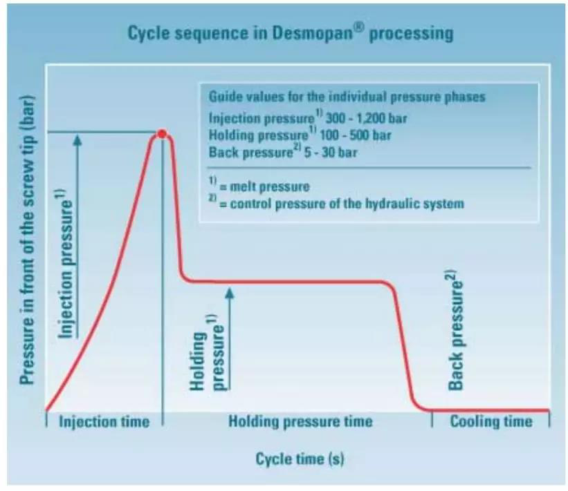 对于理想的加工,要点是对压力和注射速度的不间断的控制。其应能控制注射和保持压力在100到1200bar范围内。为了均化必须有背压力,通常设定在注射压力的1%到2.5%之间。注射速度主要基于壁厚。通常对于厚壁物品的模具需要慢的填充,而薄壁物品需要快的填充。对于注射速度除了壁厚和模穴类型,模具排气扮演重要角色,其有助于避免高压热空气导致的所谓“烧痕”。注射压力/保持压力施加较大的影响是在于空间稳定性和脱模性。