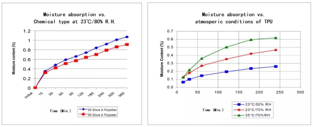 图:聚醚型和聚酯型TPU在不同条件下的水分吸收率