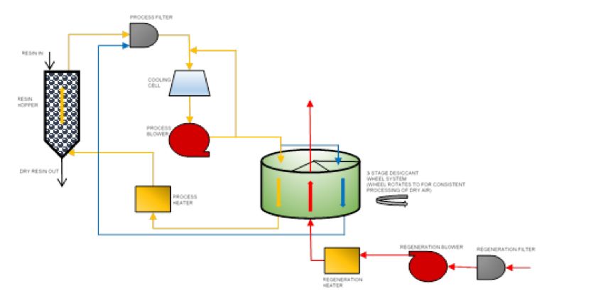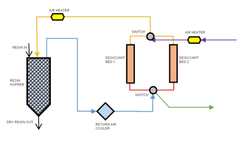 除湿干燥机的原理是在对树脂用加热的“干”空气的闭环循环。干燥出来的水分释放到经过的热空气中。“湿”空气随后通过干燥剂分子筛材料,这种材料能够从循环空气中吸收水分,使之“干燥”。有两种形式的干燥系统,一种是干燥床系统(见图6),另一种是干燥轮系统(见图7)。