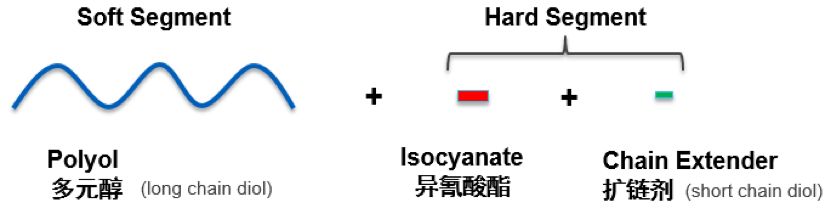 TPU(thermoplastic polyurethanes热塑性聚氨酯)是一个由硬和软段的交替序列组成的嵌段共聚物(见图1) 。它的化学结构由硬段和软段组成, 软段提供材料的柔韧性,硬段提供其热塑性、加工性和强度。硬段和软段的比例可以被设计,所以TPU有着较为广泛的硬度范围(路博润常用的医疗级TPU的硬度范围为邵氏62A到邵氏87D)。