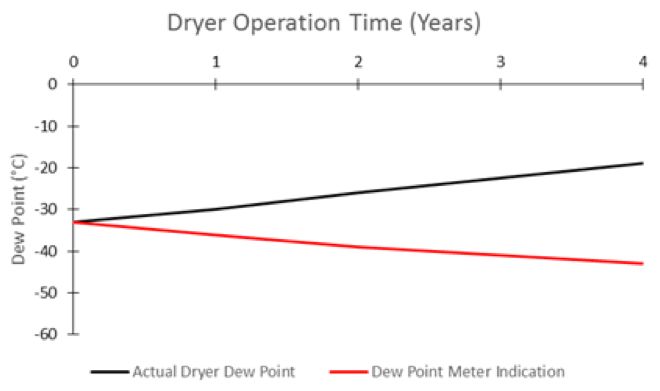 露点测量的准确度随时间的推移而迅速下降。露点表需要经常校准,尤其是连续使用时。偏差与实际发生的情况相反(也就是说,测量的露点读数会随着时间而降低) 。事实上,随着干燥剂的老化,它的效率会降低,真正的露点会上升(见图8)。