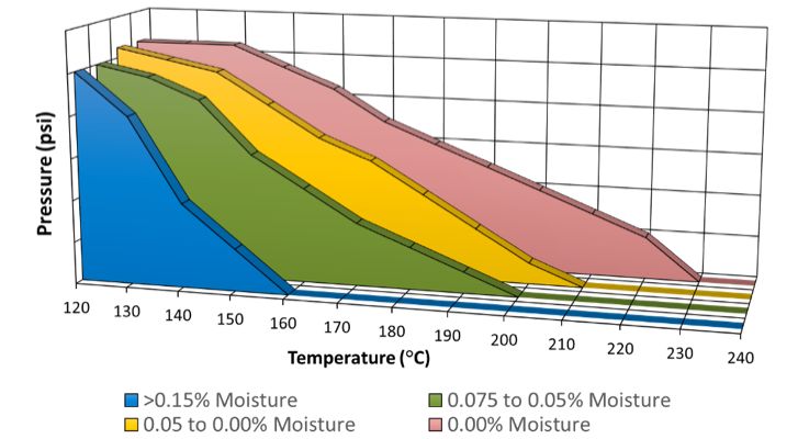 同时水分含量也决定着TPU加工的时间窗口。图5显示了芳香族TPU降解过程中温度和时间的关系。其在水分含量较高和较低时的开始降解温度为150℃和180℃,和水分有很大的关系。由于大多数芳香族TPU的加工温度都高于180℃, 含水量大于0.15%时的TPU在180℃时开始降解的时间窗口只有不到5分钟;而低含水量(< 0.05%)的TPU的稳定时间为25分钟,所以TPU材料加工前需要彻底干燥,以保证加工过程中不分解。