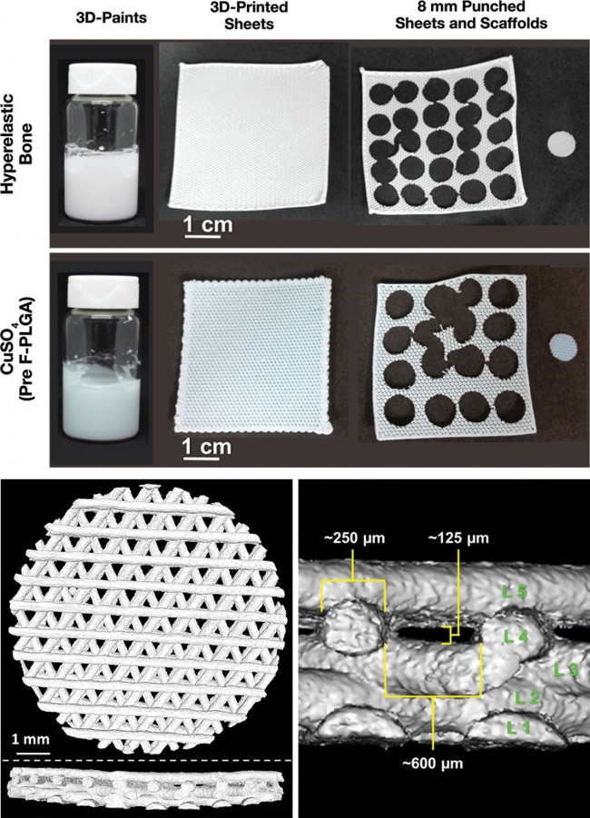 上图:超弹性骨和硫酸铜(CuSO4)材料,以及具有8mm直径的3D打印支架 ;左下图:8mm直径超弹性骨支架的微计算机断层扫描重建(自上而下和横截面视图); 右下图:微型计算机断层扫描截面图的细节,突出了相关的尺寸和特征。