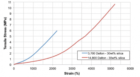 为此,Gelest公司还专门召开了媒体发布会介绍其成果。据Gelest的总裁在和首席技术总监Dr. Barry Arkles介绍说:目前市场常见的弹性体材料断裂伸长率一般在100%-1000%之间,ExSil材料断裂伸长率达到5000%,这并不仅仅是数字的增加,而是一场材料伸长率的革命。